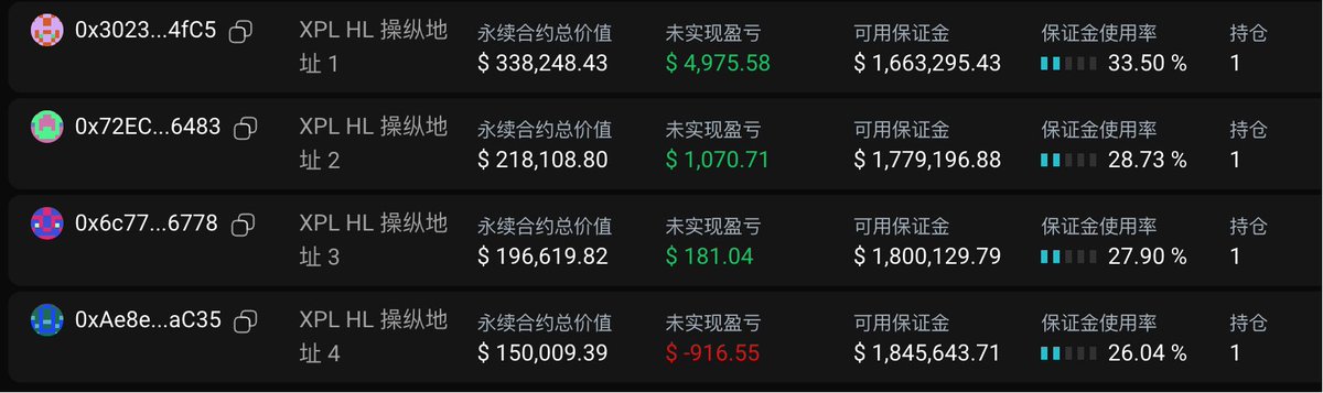 目前这四个地址仅用 20-30% 的保证金开出了价值 90.3 万美元的 1x XPL 多头仓位,预计还会加仓