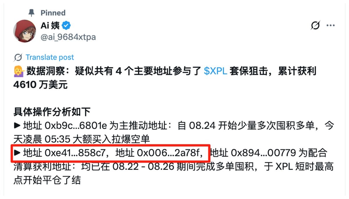 今早向 Hyperliquid 存入 1000 万枚 USDC 做多 $XPL 的四个地址,其资金来源就是 08.27 套保狙击事件的配合清算地址