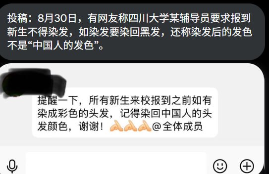 网友投稿8月30日,四川大学一名辅导员在群里通知:新生报到前不得染彩色头发,若已染发须染回黑色,并强调“染发后的颜色不是中国人的发色”。