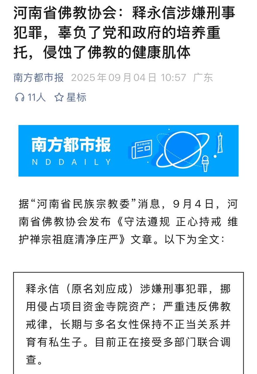 9月4日,河南省佛教协会发文:释永信涉嫌刑事犯罪,辜负了党和政府的培养重托,侵蚀了佛教的健康肌体