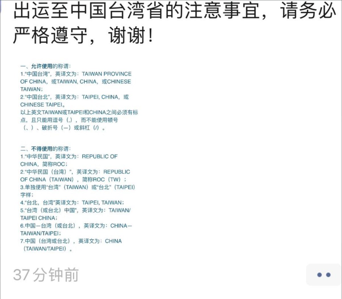 网友投稿:DHL的最新通知,关于货物寄往“台湾”的注意事项。文件明确要求只能使用“TAIWAN PROVINCE OF CHINA”“TAIWAN, CHINA”或“CHINESE TAIWAN”等 中国台湾省的称呼,城市名只能写“TAIPEI, CHINA”或“CHINESE TAIPEI”。同时,严禁使用“REPUBLIC OF CHINA”“ROC”“TAIPEI, TAIWAN”等称呼。