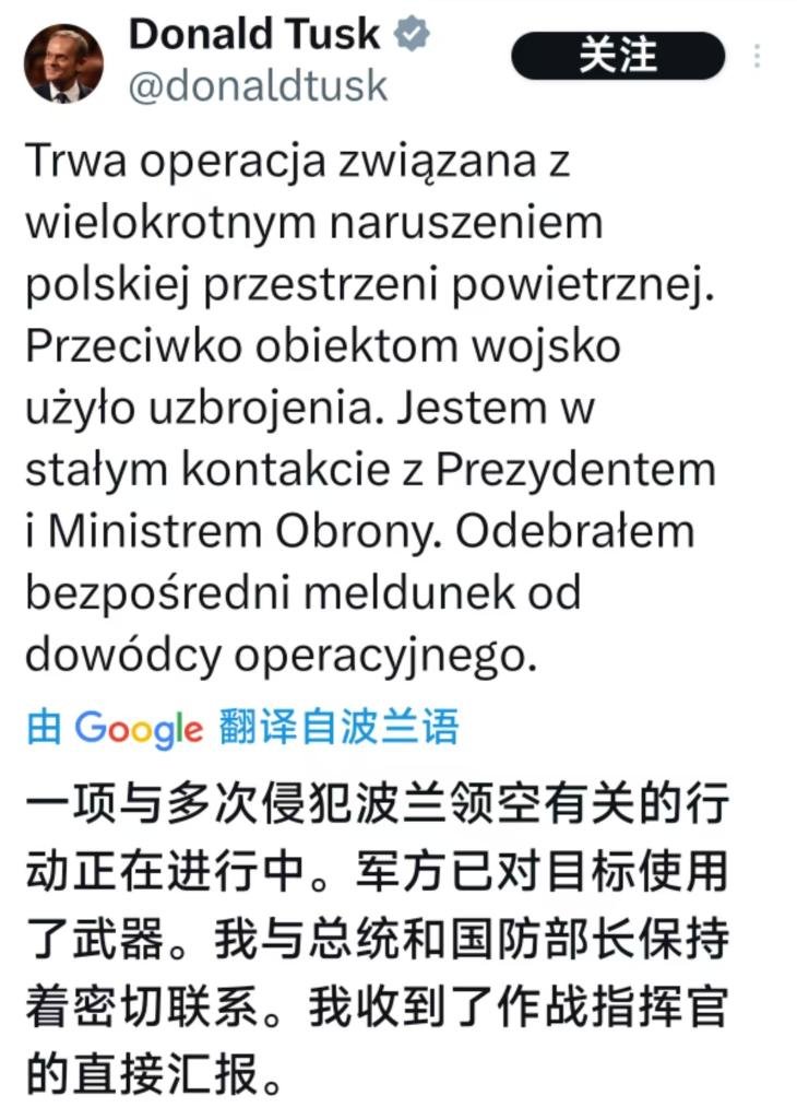 9月10日,波兰武装部队作战司令部10日表示,在俄罗斯对乌克兰西部发动空袭期间,波兰紧急动用本国和北约防空系统,击落了“侵犯”其领空的无人机。