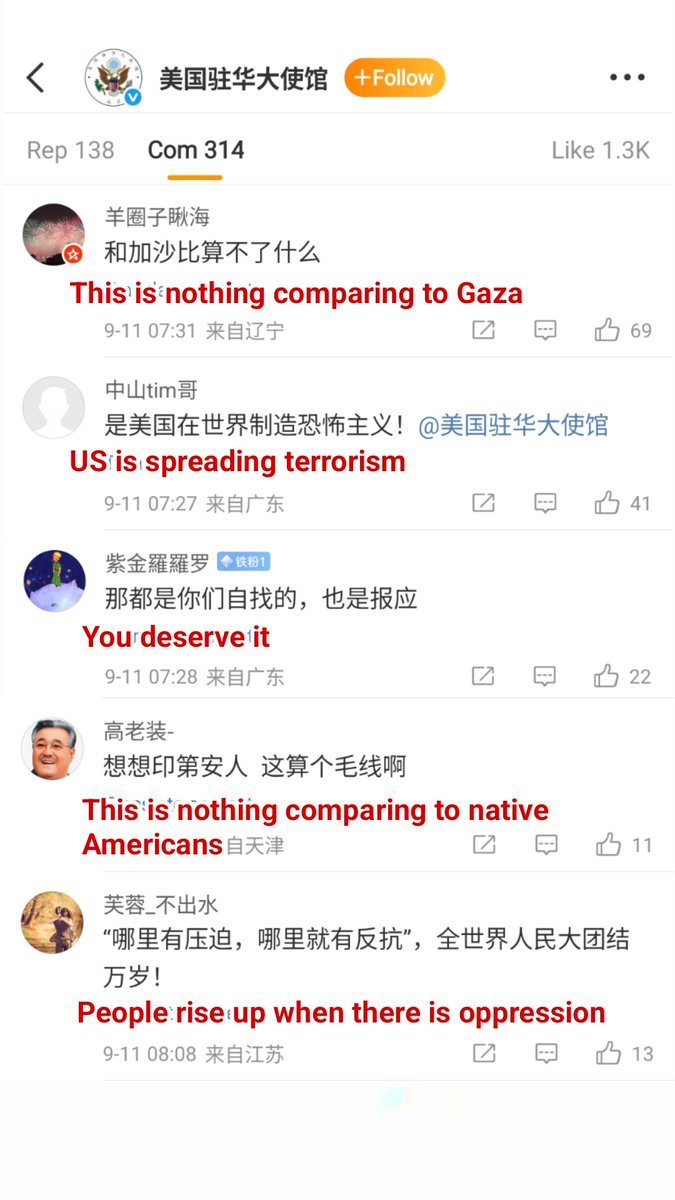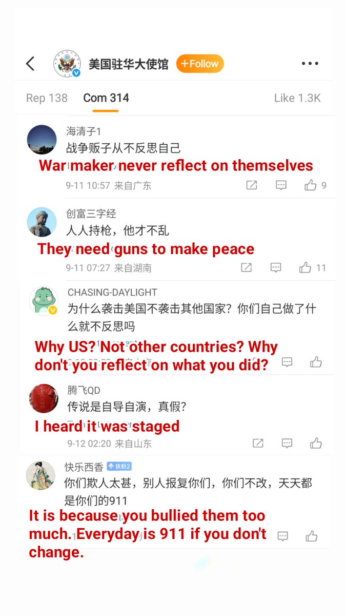911 attack was a pure tragedy by terrorist atrocity.But Chinese don't think so. Instead, they celebrated under US embassy Weibo post with zero sympathy.