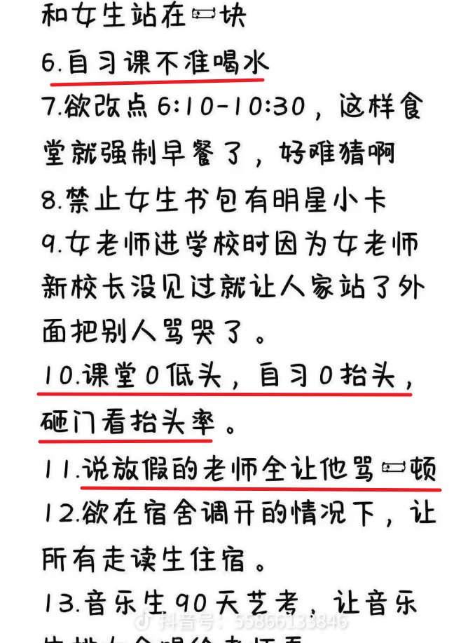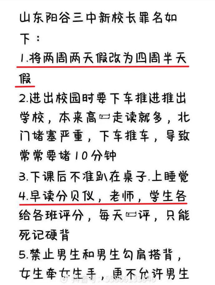 近日,山东。阳谷三中更换校长孟宪强,引发学生在抖音、小红书等平台上公开揭露其多项不当行为,包括双休形同虚设、强制学生在食堂订餐(食堂由校长亲属承包)、将学生跳楼视为违纪、擅自进入女生宿舍并指责内衣晾晒方式等。