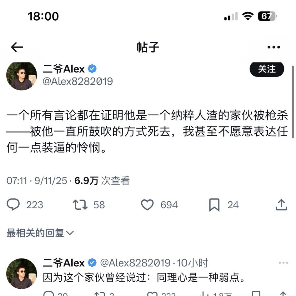 "a guy (Charlie Kirk) whose every statement proves he's a Nazi scumbag gets shot dead- dying in the exact way he's always been advocating for,and I don't even want to express a shred of fake-ass pity"