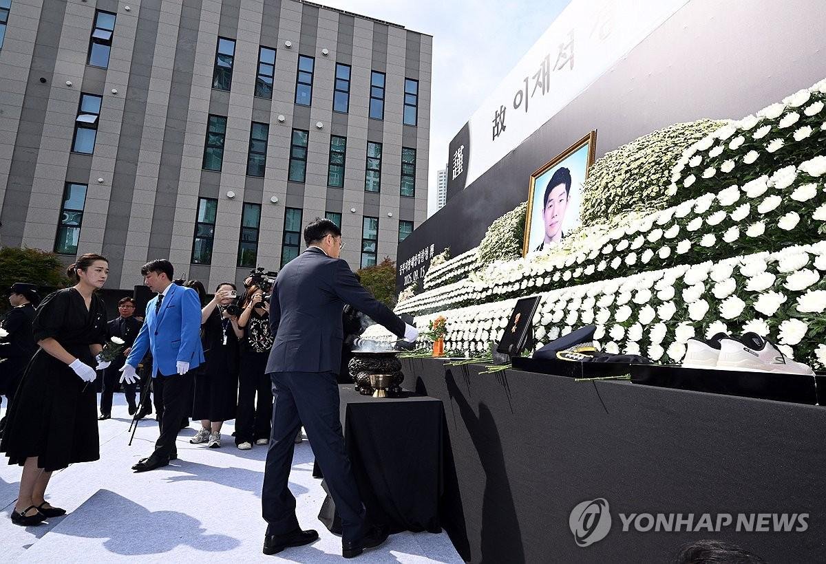 9月15日,为营救一名中国老人而不幸殉职的韩国海洋警察李在锡(音)的遗体告别仪式,中国驻韩大使馆派员致哀。