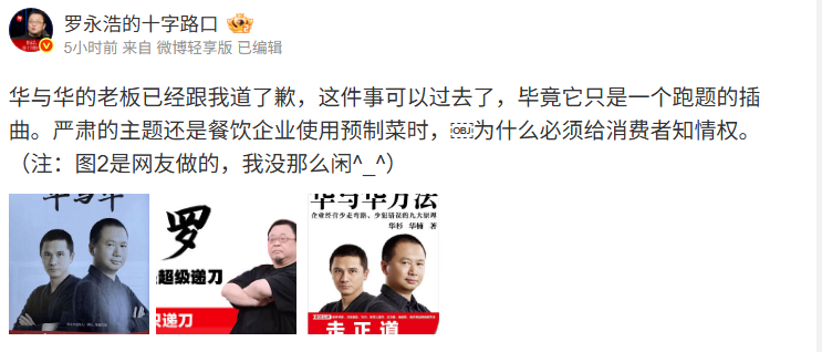 9月15日,罗永浩在微博表示:华与华的老板已经向其道了歉。