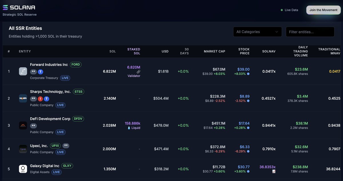 $SOL 财库实体当前总持仓突破 1700 万枚(总计持仓 1711.2 万枚),价值 40.2 亿美元,约占总供应量的 2.98%1.Forward Industries Inc 排名第一,持有 682.2 万枚 SOL,价值约 16.0 亿美元2.Sharps Technology, Inc. 排名第二,持有 214 万枚 SOL,价值约 5.031 亿美元3.DeFi Development Corp