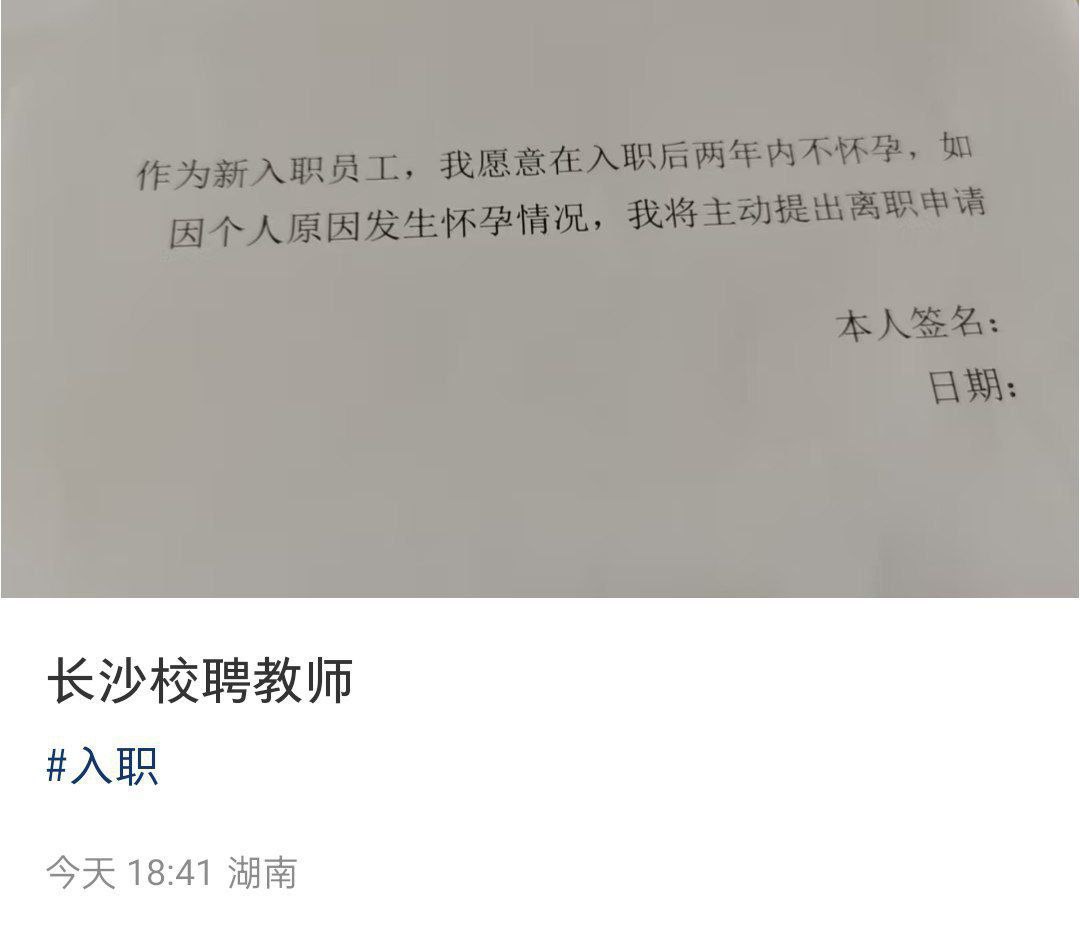 9月13日,湖南长沙雨花区。网友爆料,当地一校聘教师被要求签订“保证书”,承诺入职两年内不得怀孕,否则若怀孕需主动辞职。