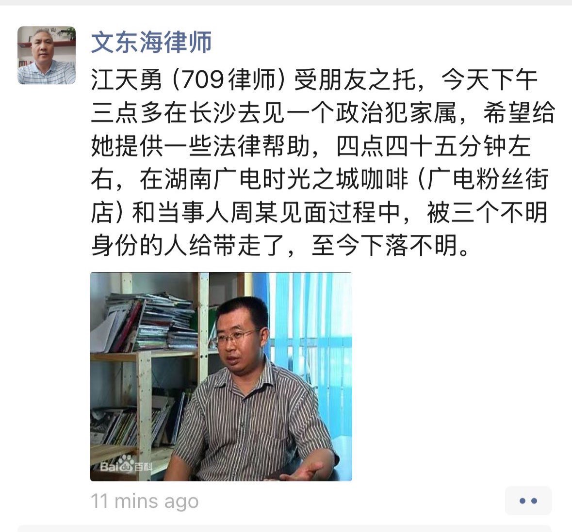 突发,江天勇律师刚刚在长沙被抓。江天勇(709律师)受朋友之托,今天9月16日下午三点多在长沙去见一个政治犯家属,希望给她提供一些法律帮助,四点四十五分钟左右,在湖南广电时光之城咖啡(广电粉丝街店) 和当事人周某见面过程中,被三个不明身份的人给带走了,至今下落不明。