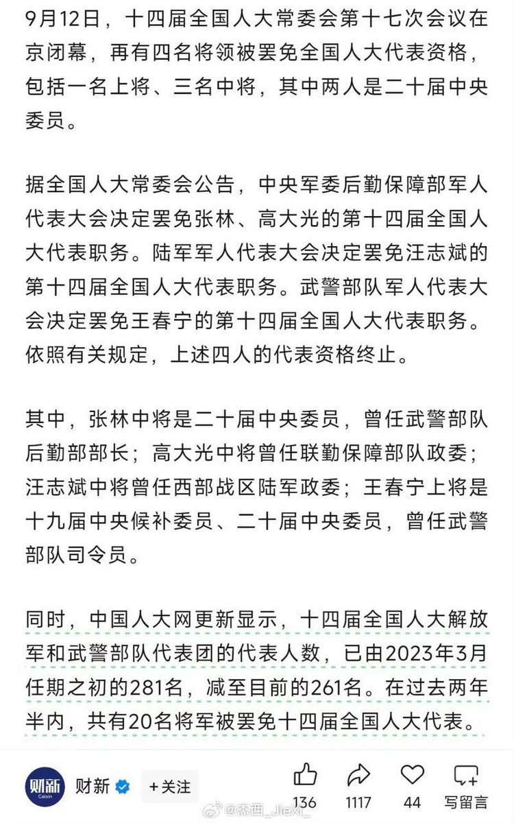 9月12日,全国人大常委会第十七次会议决定,再有四名将领被罢免全国人大代表资格,包括一名上将、三名中将,其中两人为二十届中央委员。