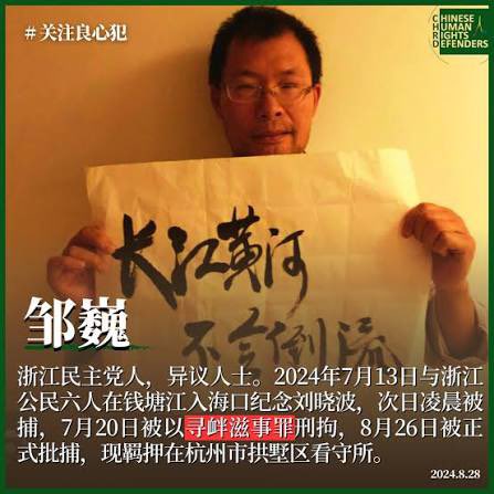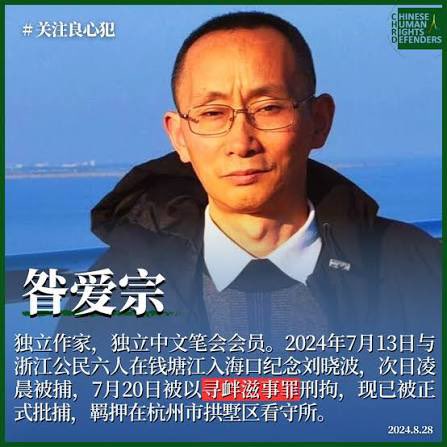 2024年7月13日,因悼念刘晓波,昝爱宗和邹巍等人被抓捕。明天昝爱宗开庭审理,本周五邹巍开庭审理。请大家多多关注。在杭州拱墅法院审理开庭。#海祭无罪#释放昝爱宗#释放邹巍