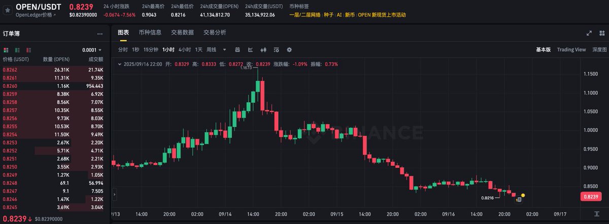 过去一周小章鱼 $OPEN 在高潮后一路回落,基本与我预期一致,当时也喊了大家撤退,算是有始有终了,毕竟总是需要有一段贤者时间的,男人们都懂。目前币价高点回撤接近一半,我又进了一点小仓位测试看看能不能站住。原因有二:1、今天从圈子里听说了
