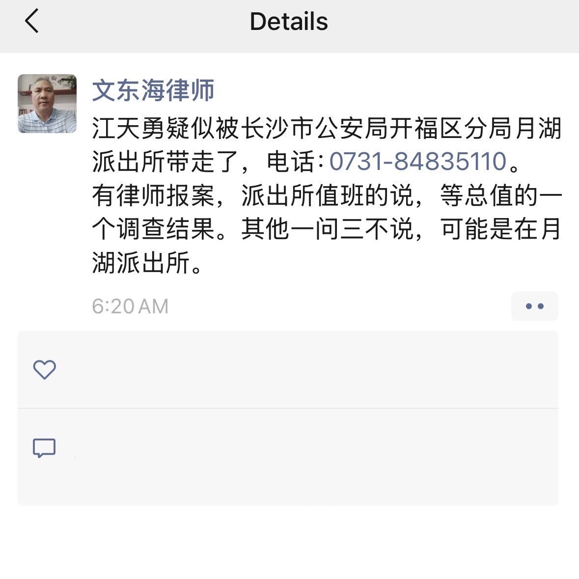 我问:江天勇无任何违法之处,为什么要等市局发消息?什么时候发消息?