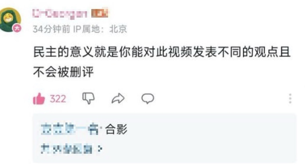 目前,评论区中这条写着“民主的意义就是你能对此视频发表不同的观点且不会被删评”的留言,已被删除。