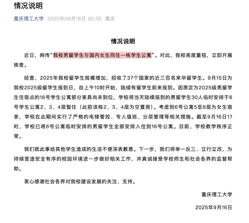 9月16日,重庆理工大学就“留学生与国内女生同住一栋公寓”的传闻发布情况说明。校方称,由于2025级留学生报到人数超出预期,临时将30名男留学生安置在16号公寓未分配完的宿舍中。考虑到6号公寓楼层原为女生宿舍,校方对部分楼层进行了临时调整。