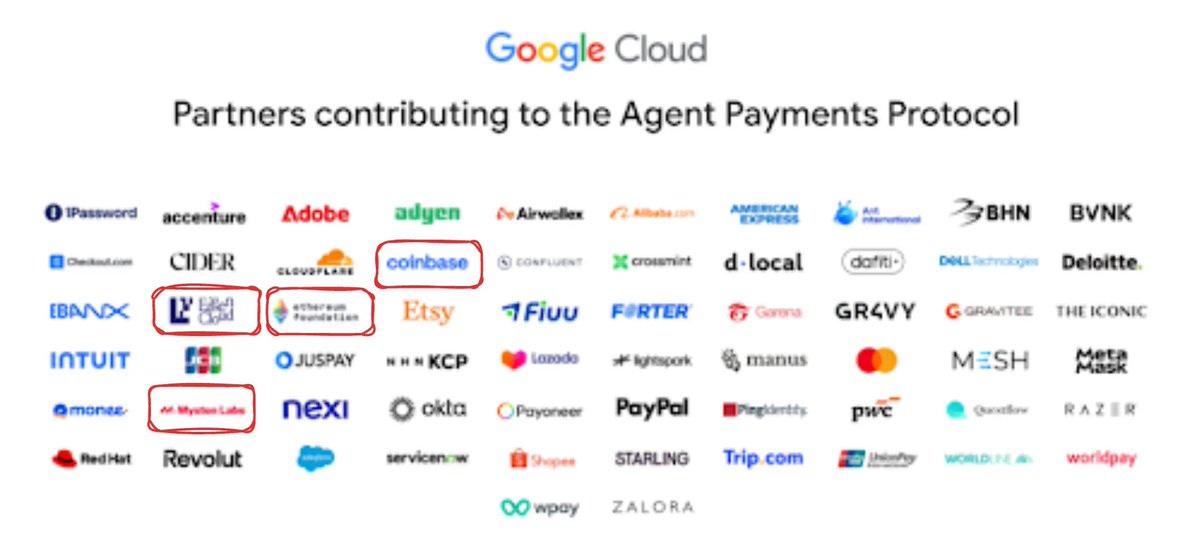 冒险如微策略,All in Web3稳健如 Google,不可能选择梭哈,但也不想错过Google 新推出的代理支付协议 (AP2) 合作伙伴中,竟然提到了几个区块链项目:包括 EigenCloud(即 EigenLayer) / 以太坊基金会 / Coinbase / MetaMask / Mysten Labs(Sui 开发商) 等,主要聚焦于基础设施相关业务合作,