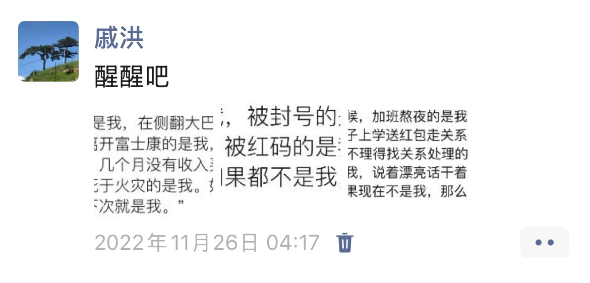 我在22年11月26日转发过一个群里的段子,所以我为什么觉得在那里生活的每个人都是受害者,尤其是普通人不要再为共产党唱赞歌了,不要觉得现在岁月静好,党棍的铁拳随时都会砸到你的头上。只有你们才能让邪恶的车轮停止转动。