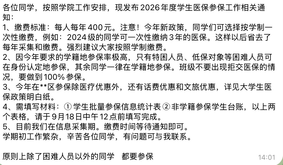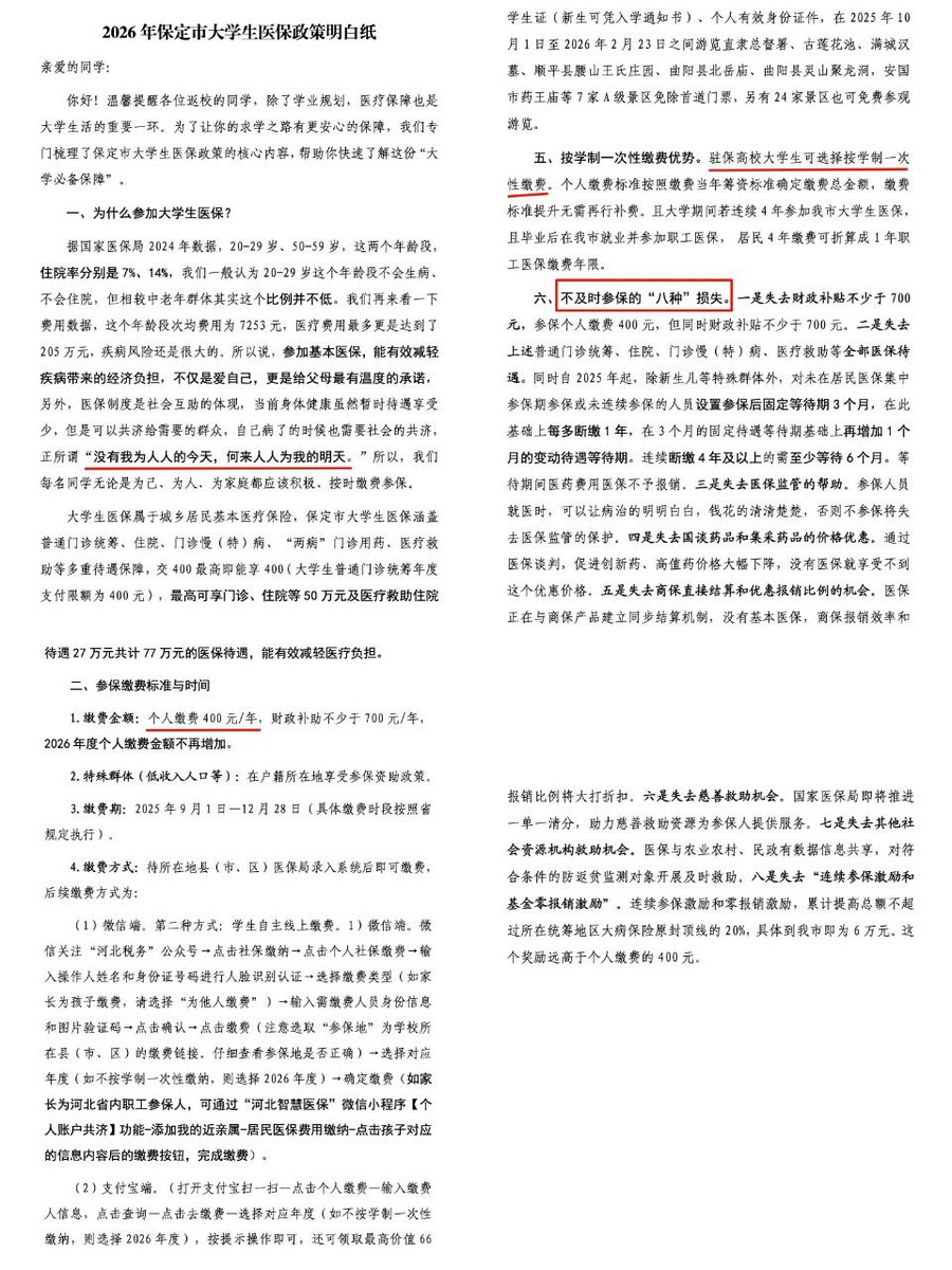 网友投稿: 9月17日,河北保定市 要求大学生必须在学籍地统一强制缴纳医保,每人每年 400 元,还鼓励一次性预缴三年费用。政策文件明确,除极少数特困人员外,其余学生必须 100% 参保。否则将面临等待期和报销受限等惩罚措施。  文件中甚至专门用一大段落列举了“不及时参保的八种损失”,进一步强调了强制性。