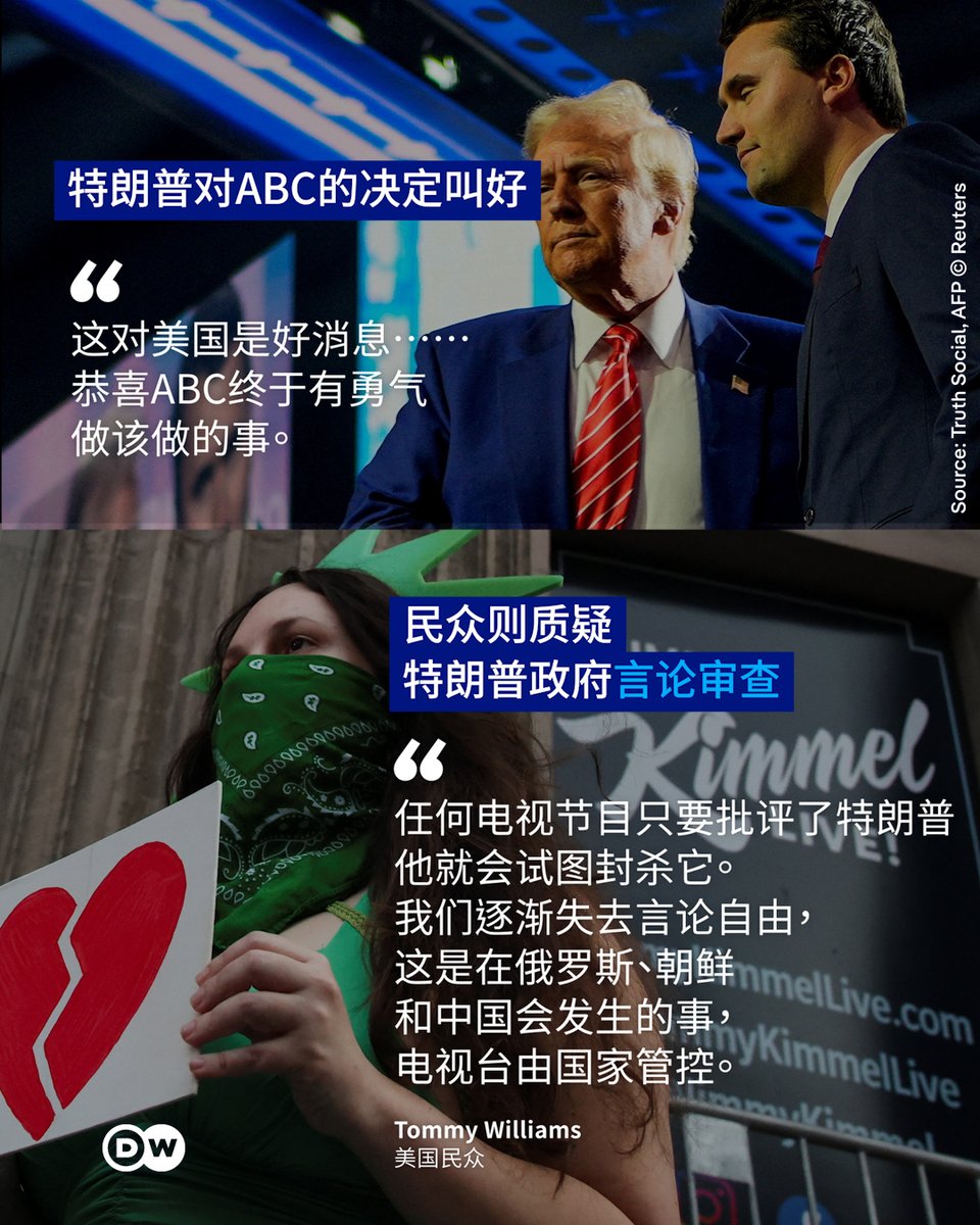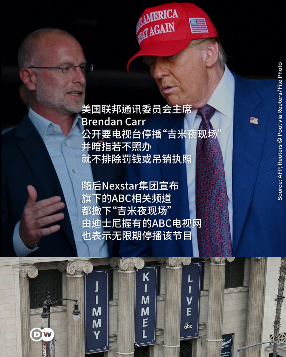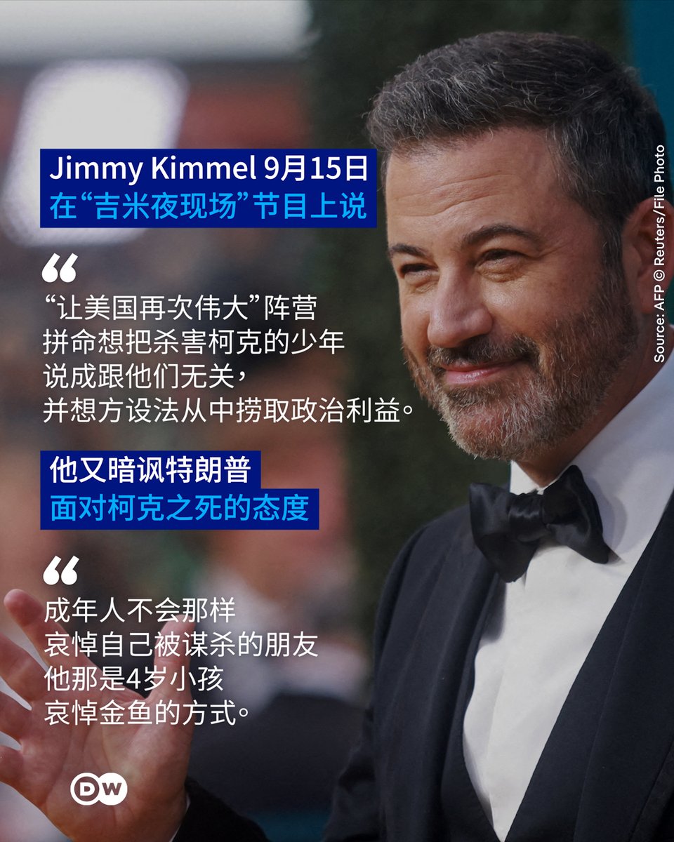 美国知名脱口秀主持人Jimmy Kimmel 的节目"吉米夜现场"18日遭ABC电视台停播,原因涉及他在节目上谈及保守派倡议人士柯克(Charlie Kirk)遇害,引发争议。停播前,特朗普政府的官员曾公开要求相关电视频道下架该节目,甚至暗示如果不这么做就会对其吊销执照。 事件发生之后,有民众批评政府干预言论自由,质疑称节目批评特朗恐怕就会遭"封杀"。你认同电视台的决定吗?留言跟我们分享你的看法。