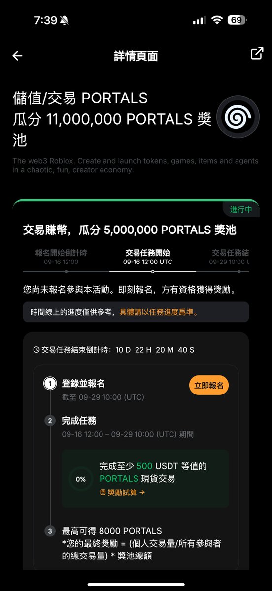 我刚才去看了一眼,以上一期的 Splash 项目 $PORTALS 为例,他们拿出来1100 万枚 PORTALS 奖励,目前市价 200 多万,其中前 10000 名新用户入金是可以拿到 600 Portals ,即便现在价格也有 110 刀左右。