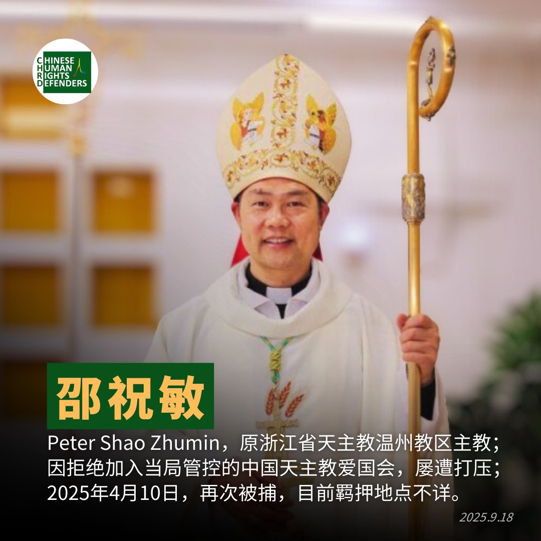 据维权网报道,2025年4月10日,原浙江省天主教温州教区主教 #邵祝敏 再次被捕,目前羁押地点不详。他因拒绝加入当局管控的中国天主教爱国会,屡遭打压,此前曾多次被捕。