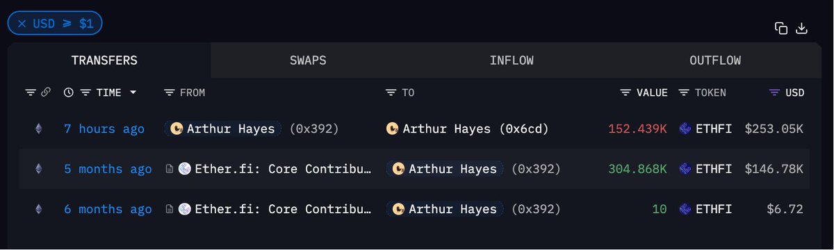 Arthur Hayes 在 7 小时前收到 投资人分配地址转移的 79.6 万枚 $ETHFI ,价值 132.2 万美元🤓两个地址 0x2f8...D699b 和 0x392...0c637 累计从项目方地址处收到了 159.2 万枚代币,但只有一部分转给了老黑,因此归属暂不明确他目前共持有 201.3 万枚 ETHFI,总价值 328