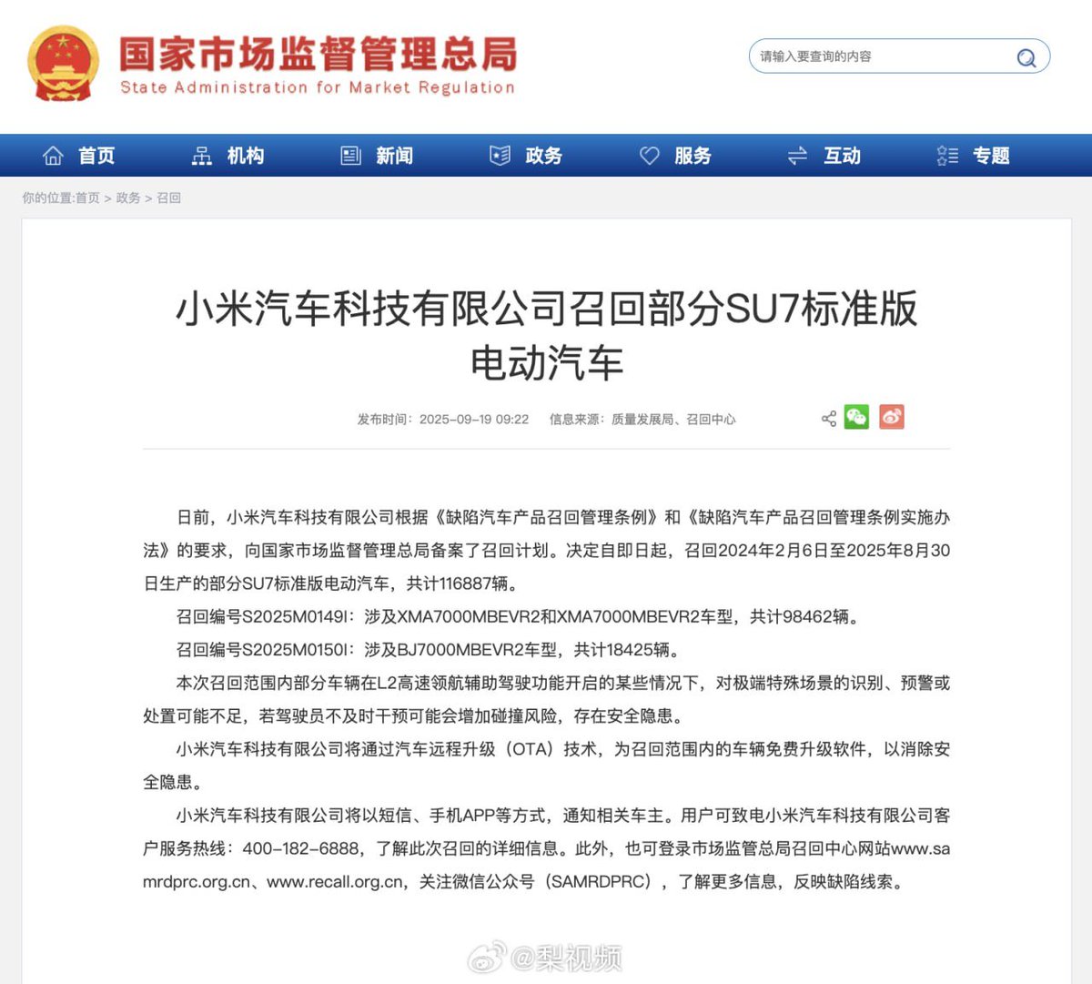 突发:小米汽车科技有限公司召回116887辆SU7标准版电动汽车。本次召回范围内部分车辆在L2高速领航辅助驾驶功能开启的某些情况下,对极端特殊场景的识别、预警或处置可能不足,若驾驶员不及时干预可能会增加碰撞风险,存在安全隐患。