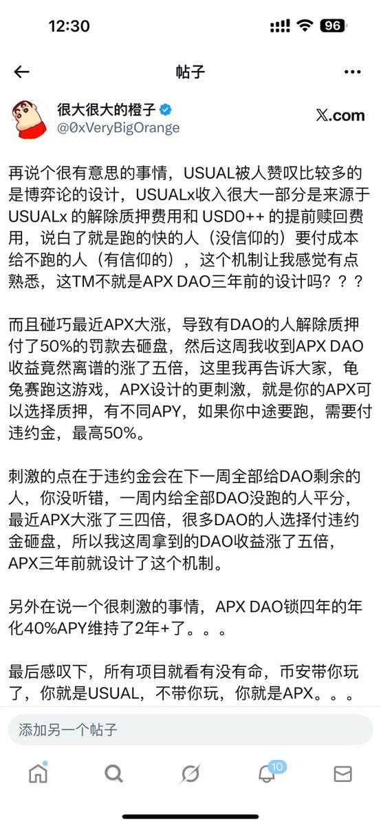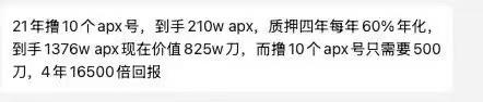 群里人发的截图【图1】,我可以证实,大差不差,是真的,这也是为什么我去质押四年还滚仓质押,而且中途有人退出,后面不退出的人吃退出人一半收益,因为退出罚款一半。 我以前就分析过,Usual那个学APX的【图2】,Apx这项目,推特上应该没几个人比我更了解了,从头到尾参与到今天。 回头看我不会告诉你锁仓四年有多香🤣 我最服气我的是我被盗第二天就自己花钱把Apx买回来了,买回来的翻了20倍。 我没什么财富密码,没什么认知,主打一个拿的住,只是做最简单的事情。