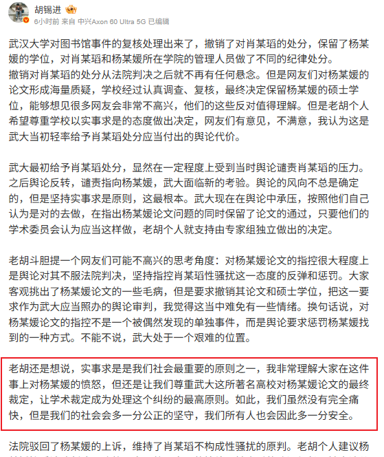 9月20日,胡锡进评论武汉大学通报图书馆事件:我非常理解大家在这件事上对杨某媛的愤怒,但还是让我们尊重武大这所著名高校对杨某媛论文的最终裁定,让学术裁定成为处理这个纠纷的最高原则。如此,我们虽然没有完全痛快,但是我们的社会会多一分公正的坚守,我们所有人也会因此多一分安全。