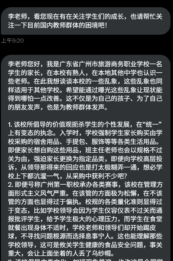 /广东省广州市旅游商务职业学校 家长投稿李老师,看您现在有在关注学生们的成长,也请帮忙关注一下目前国内教师群体的困境吧!希望能通过曝光这些乱象让现状能得到哪怕一点改善。这不仅是为自己的孩子、为了自己的朋友发声,也是为教师群体发声。