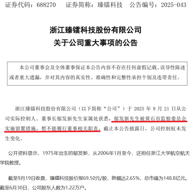9月21日,浙江大学教授、晶片上市公司董事长被湖北黄石监察委留置 ,身家高达31亿元。据臻镭科技公告称,公司实际控制人、董事长郁发新被黄石市监察委员会实施留置措施,暂不能履行董事相关职责。公司控制权未发生变化,日常经营管理由公司高级管理人员负责。