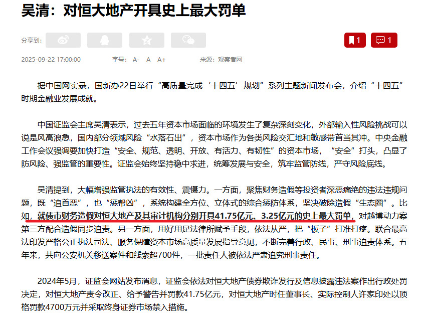 9月22日,据中国网实录,国新办举行“高质量完成‘十四五’规划”系列主题新闻发布会,中国证监会主席吴清提到就债市财务造假对恒大地产及其审计机构分别开具41.75亿元、3.25亿元的史上最大罚单