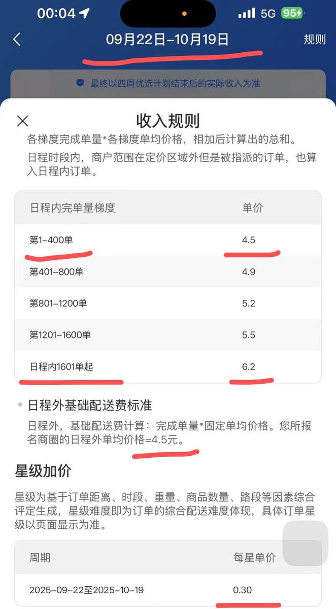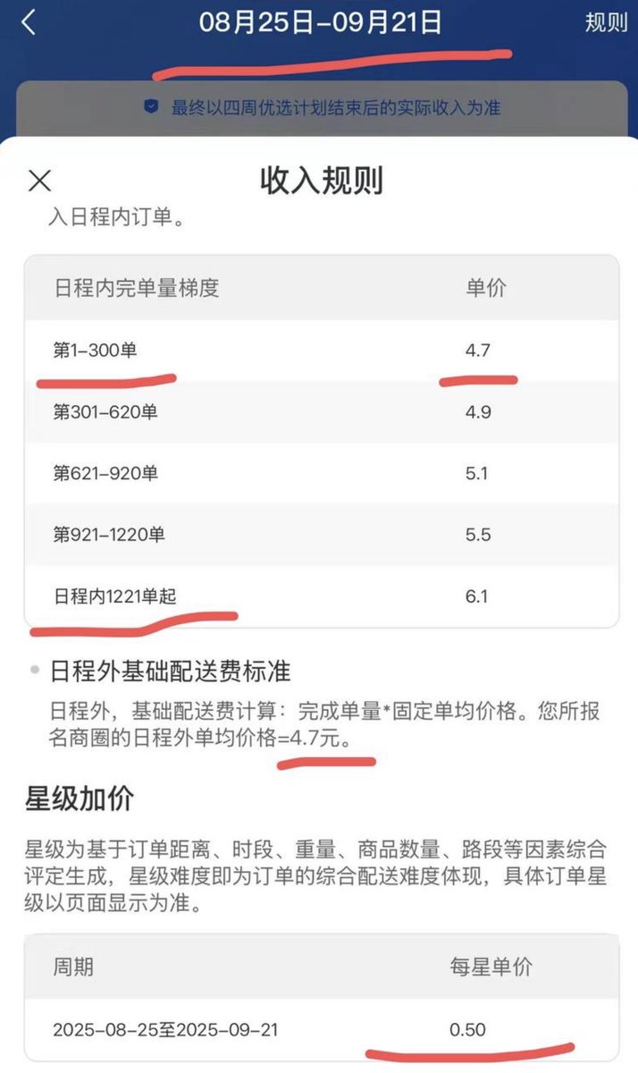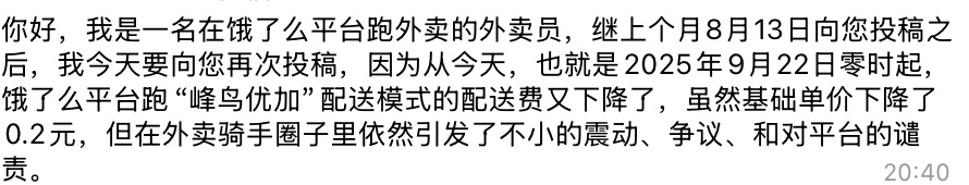 网友投稿 9月22日,饿了么平台“峰鸟”配送模式再度下调配送费。 投稿人是一名在杭州从事外卖工作的骑手,自2020年5月起在饿了么平台跑单。 他表示,从9月22日零时起,基础配送单价由每单4.7元下调至4.5元,且需完成401单后才可享受每单4.9元的单价(P3)。此前, 跑满301单即可提价(P2)。相比而言,这一调整门槛大幅提高。 投稿人称:“几乎每年都降一次价。” 不少骑手在群内质疑平台不断压低价格,却从不正面回应骑手权益问题。