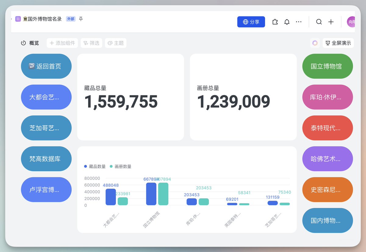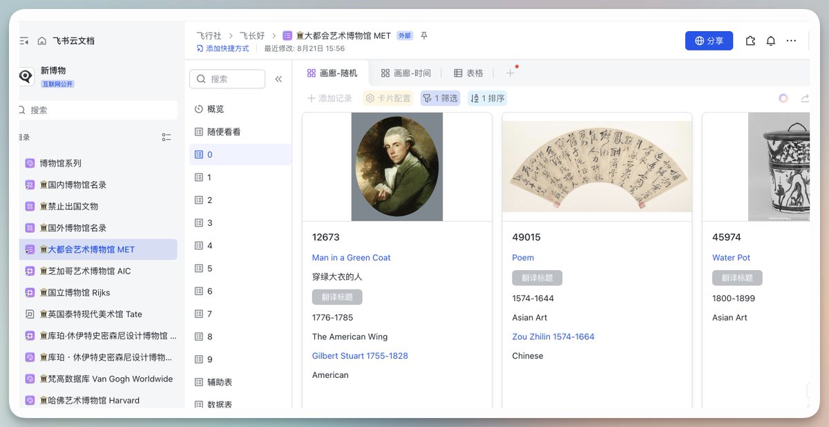 总是能在飞书看到神级文档...作者在天津,今儿晚上一起撸的串。他抓取整理了全球博物馆155万份藏品和画册,放在了飞书文档。用飞书的各种功能实现自动翻译、搜索,绝了!地址见评论区