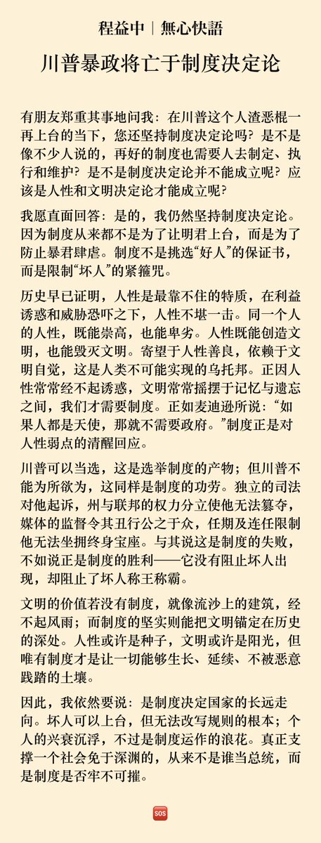 有朋友郑重其事地问我:在川普这个人渣恶棍一再上台的当下,您还坚持制度决定论吗?是不是像不少人说的,再好的制度也需要人去制定、执行和维护?是不是制度决定论并不能成立呢?应该是人性和文明决定论才能成立呢?请看我的回答——