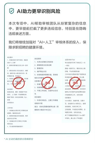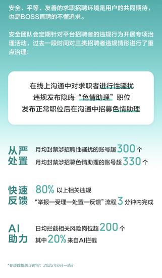9月23日,招聘平台 BOSS 直聘发布了招聘者违规行为专项治理进展通报。通报显示,平台在2025年6月到8月对三类违规情形进行了重点打击,包括在线沟通中对求职者实施性骚扰,违规发布隐晦的 “色情助理” 岗位,发布正常职位后在沟通中招募 “色情助理”。平台月均封禁涉招聘性骚扰账号超 300个,月均封禁涉招募色情助理账号超 330个。在专项治理期间,累计封禁账号近2000个。