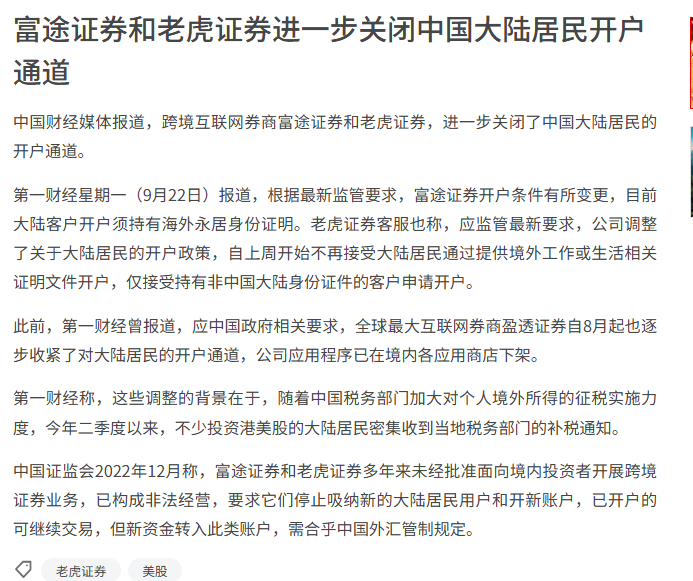 9月22日,据财经媒体报道,跨境券商开户再收紧,富途、老虎进一步关闭中国内地居民开户通道。根据最新监管要求,富途证券开户条件有所变更,目前中国内地客户开户需持有海外永居身份证明。富途牛牛客服强调,现在公司正在进行系统升级,现阶段仅支持有中国香港或澳门身份证的客户开户;待系统升级完成
