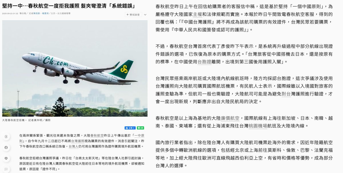 9月22日上午,春秋航空客服在回复购票者 接受《联合报》记者采访时称,基于“一个中国原则”,自9月12日起,台湾护照不再被视为有效购票证件,台湾民众若要购票,需使用 中华人民共和国签发或认可的护照。