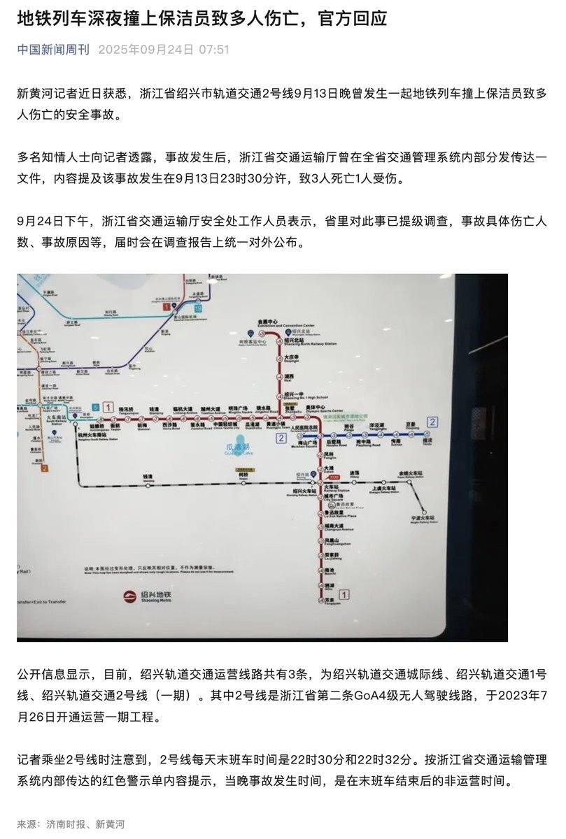 浙江绍兴,地铁在营运时间结束后一个小时还在开,导致在通道里打扫的清洁员3死1伤。在不小的城市里,这么大的新闻捂了11天。一点消息都没漏出来。现在中国的调查新闻已经完蛋了。