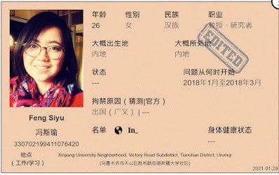 According to internal police intelligence from Urumqi obtained by The Intercept, in October 2017, authorities investigated Feng Siyu because her OnePlus phone contained “foreign software.” Absurdly, the same police report noted that this software was a pre-installed program on the smartphone, with no evidence that Feng Siyu had ever used it. Nevertheless, this young scholar was arrested in 2018 and subsequently vanished without a trace. It is believed that Feng Siyu was sentenced to 15 years in prison in 2018 and may have been transferred from a Xinjiang prison to one in her home province of Zhejiang.