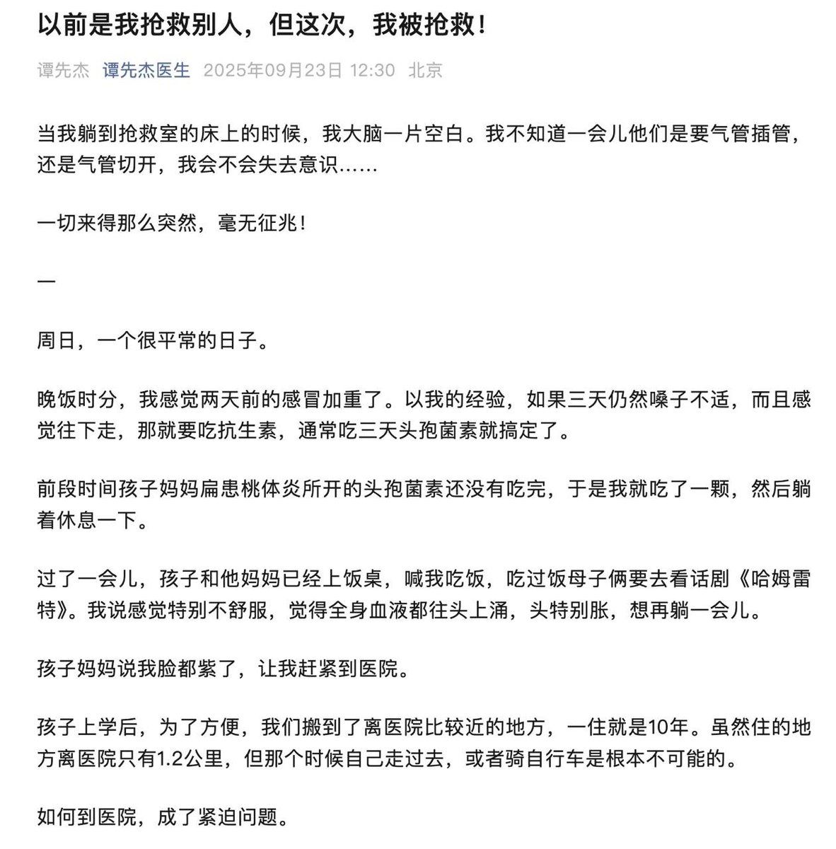 9 月 23 日,北京协和医院专家谭先杰教授吃头孢过敏被送进抢救室。