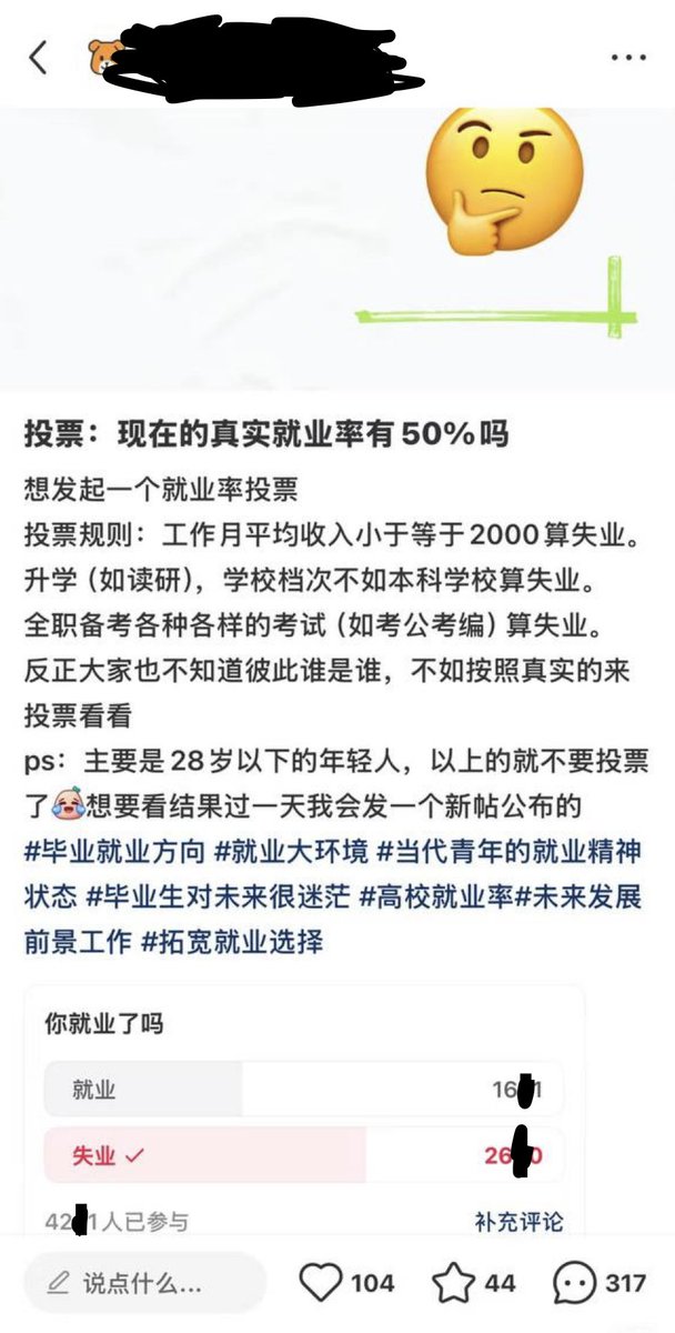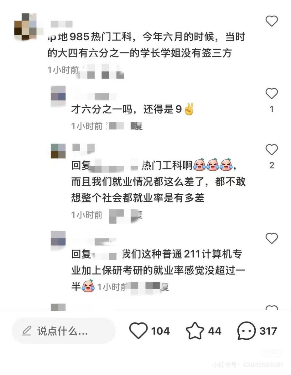 9月26日,小红书一个就业率投票的帖子,4000多人当中仅有1600人已就业,该博主还对此数据做了分析。评论区有网友称,即使是985大学的热门工科,6月毕业前也有1/6的学长学姐没有找到工作。