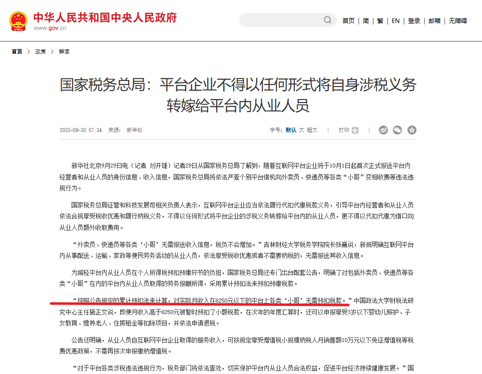 近日,国家税务总局发文:平台企业不得以任何形式将自身涉税义务转嫁给平台内从业人员。国家税务总局还专门出台配套公告,明确了对包括外卖员、快递员等各类“小哥”在内的平台内从业人员取得的劳务报酬所得,采用累计预扣法来预扣预缴税款。“按照公告规定的累计预扣法来计算,对实际月收入在6250元以下
