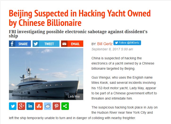 美国《自由灯塔》报道:北京被怀疑动用黑客攻击郭文贵的游艇。文章提到,自游艇事件发生后,FBI迅速介入调查,但目前拒绝评论;与此同时,FBI也在调查几起大型船只被黑客攻击的事件。全文