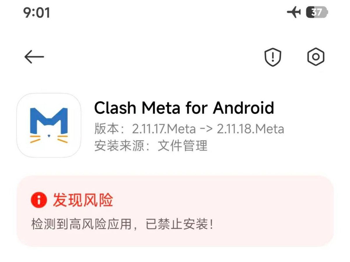 网友投稿:10月15日,小米澎湃OS已无法通过“断网”、“飞行模式”安装翻墙软件Clash了。在此之前,小米手机虽然联网时显示“禁止安装”,但用户可通过暂时断网、关闭“绿色守护”安装翻墙软件Clash,现在这种方法也被堵死。目前只能通过Shiziku+第三方安装器安装,且更新时也会出现此类“禁止安装”弹窗。