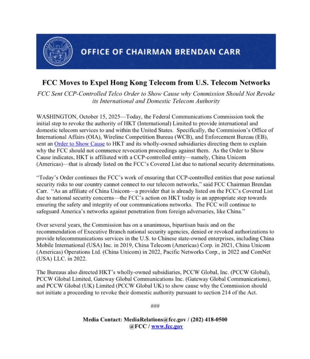 由于中国侵略香港,今天,美国决定撤销香港电讯(HKT)接入美国电信网络的授权