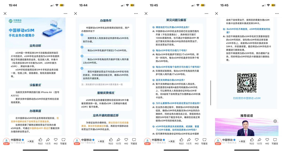 近日,中国移动在其微信公众号上发布了一篇关于eSIM卡的业务管理须知,内容明确如下: 1、eSIM卡业务仅支持线下移动营业厅办理,需现场办理并完成激活。 2、仅支持在中国大陆上市的移动终端设备,暂不支持海外设备。 3、一个人名下最多5个移动号码。 4、同一台支持eSIM的手机,最多可以绑定2个eSIM号码。 5、每台eSIM手机每自然月最多可新入网开通2次eSIM号码。 6、若丢失或更换手机,需携带新手机和有效身份证件前往线下营业厅办理eSIM换卡业务,无法自行更换。