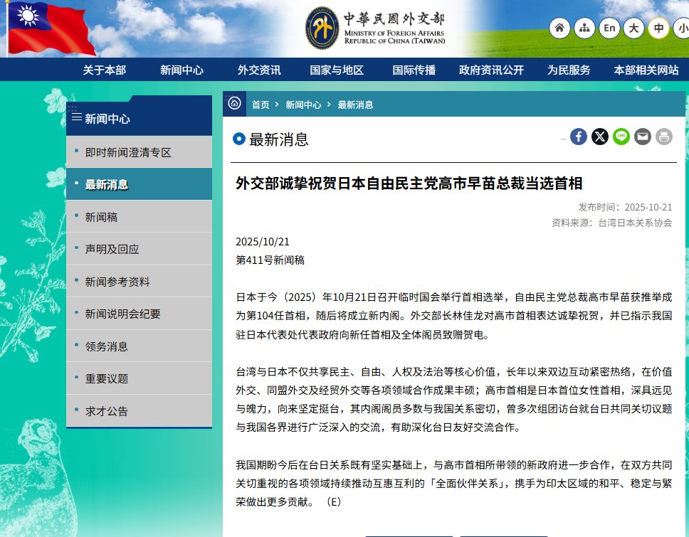 10月21日,台湾外交部祝贺日本自由民主党高市早苗总裁当选首相。