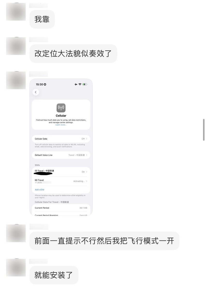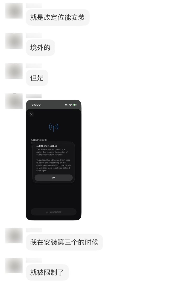 放弃幻想,之前爱范儿提到的国行 iPhone Air eSIM 限制现在看来是准确的。今早有人测试只安装 1 个国内 eSIM 时,总数不受限制,这个“漏洞”看起来已经被 OTA 修复了,上限写死 2 个。非国内 eSIM 只能在境外添加,但目前看用 anygo 改定位 + 飞行模式可破。(图来自小红书群)